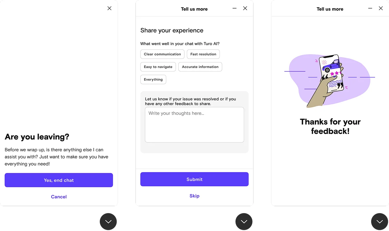 In order to reduce support contacts and provide a more efficient way to access information about Turo, a conversational AI chatbot was developed. The design and development phase of the chatbot necessitated close collaboration across multiple functions, notably involving a Content Designer, dedicated UX research, and rigorous QA efforts.